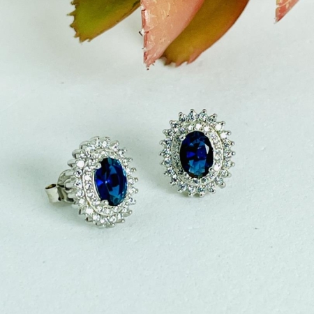 • Brincos Prata com Banho de Ródio e Pedra Safira Azul