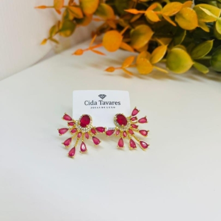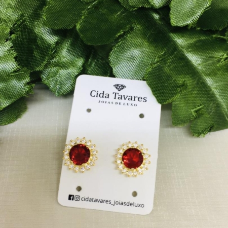 • Brinco Cravejado Nas Laterais Com Pedra Central Vermelho Rubi