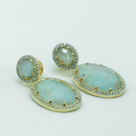 • Brinco De Pedra Natural Água Marinha Cravejado De Zircônias