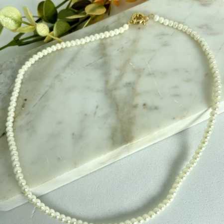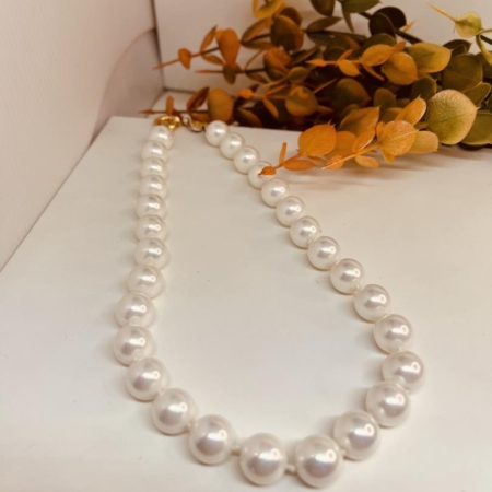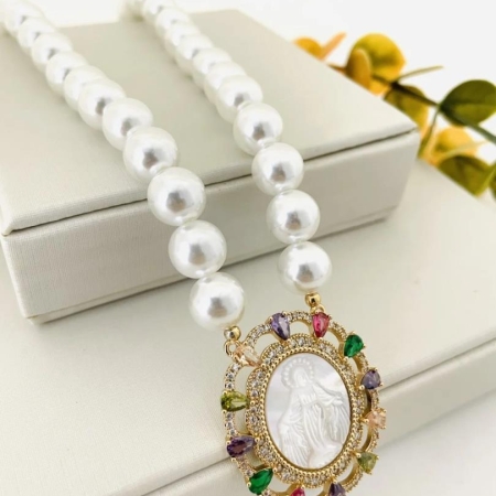 • Colar de Pérola Sintética Branca Tamanho Médio com Pingennte N Sra das Graças em Madrepérola