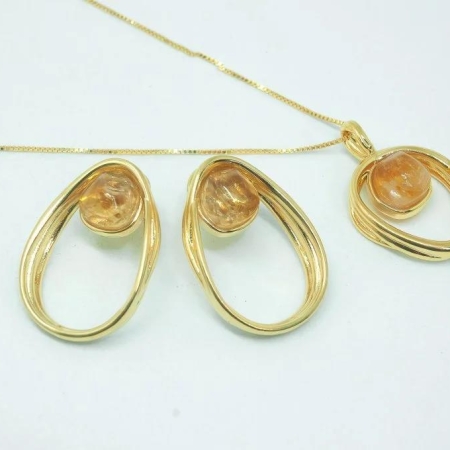 • Conjunto Colar Com Pingente E Brinco Com Pedra Natural Citrino