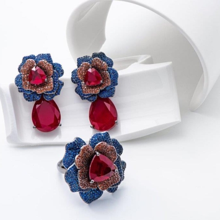 • Anel E Brinco Com Pedras Rubi e Safira Azul