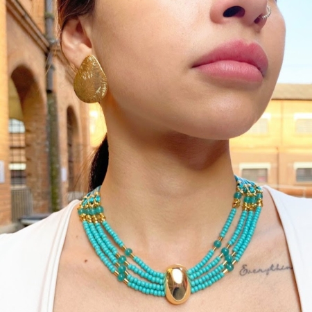 • Gargantilha Missanga em Vidro, Pedra Olho de Gato e Metal Banhado