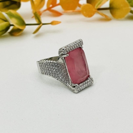 • Anel com Pedra Natural Rosa com Banho de Ródio e Zircônias Cravejadas